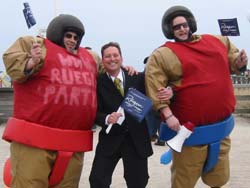 Hotelier Oliver Waechter zeigt Flagge für Rügen zwischen Sumi-Ringern,